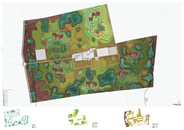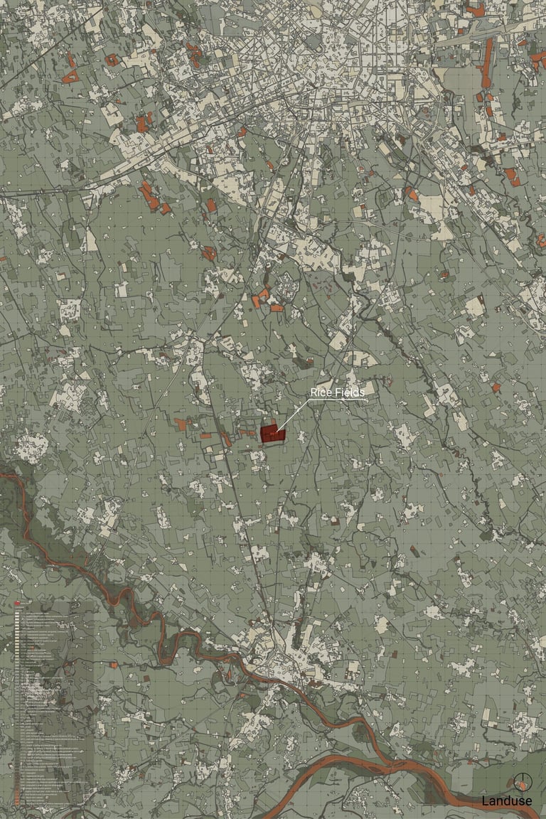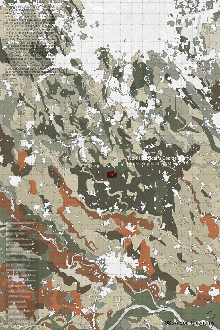 The site’s soil, classified as “Typic Hapludalfs Coarse loamy, Mixed, Superactive, Mesic,” reveals a moderately fertile profile with good drainage, a high nutrient retention capacity, and a temperate climate suitability. While adequate for agricultural activities, the coarse-loamy texture indicates that soil structure and organic matter content could benefit from improvement to enhance water retention and long-term productivity. The current land use, dominated by rice cultivation as seen across much of the surrounding farmland, reflects a production-oriented system focused on monoculture. Such use prioritizes yield over ecological diversity and livability, often leading to soil degradation and a lack of integration with natural ecosystems. This highlights the need for a transformation from purely production-oriented landscapes to sustainable, human-centered spaces that balance food production with ecological and social well-being.