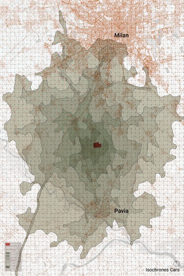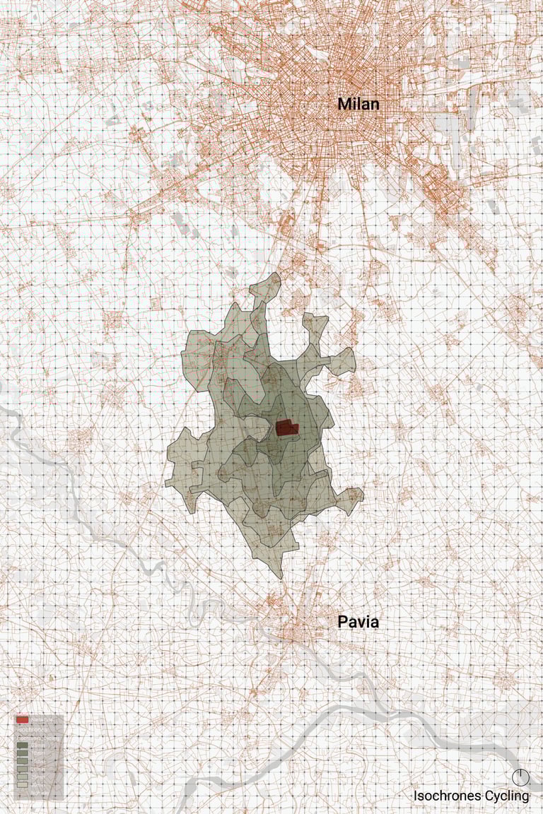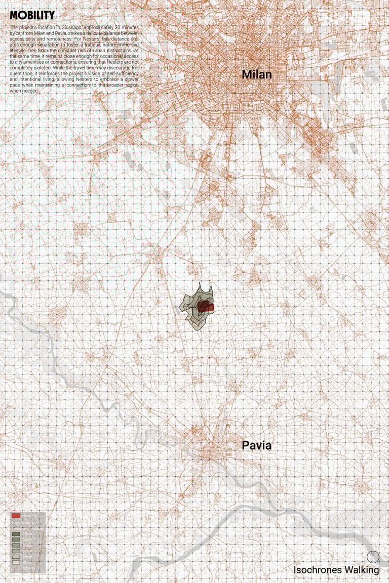 The project’s location in Giussago, approximately 30 minutes by car from Milan and Pavia, strikes a delicate balance between accessibility and remoteness. For Nesters, this distance creates enough separation to foster a tranquil, nature-immersed lifestyle, free from the constant pull of urban distractions. At the same time, it remains close enough for occasional access to city amenities or connections, ensuring that Nesters are not completely isolated. While the travel time may discourage frequent trips, it reinforces the project’s vision of self-sufficiency and intentional living, allowing Nesters to embrace a slower pace while maintaining a connection to the broader region when needed.