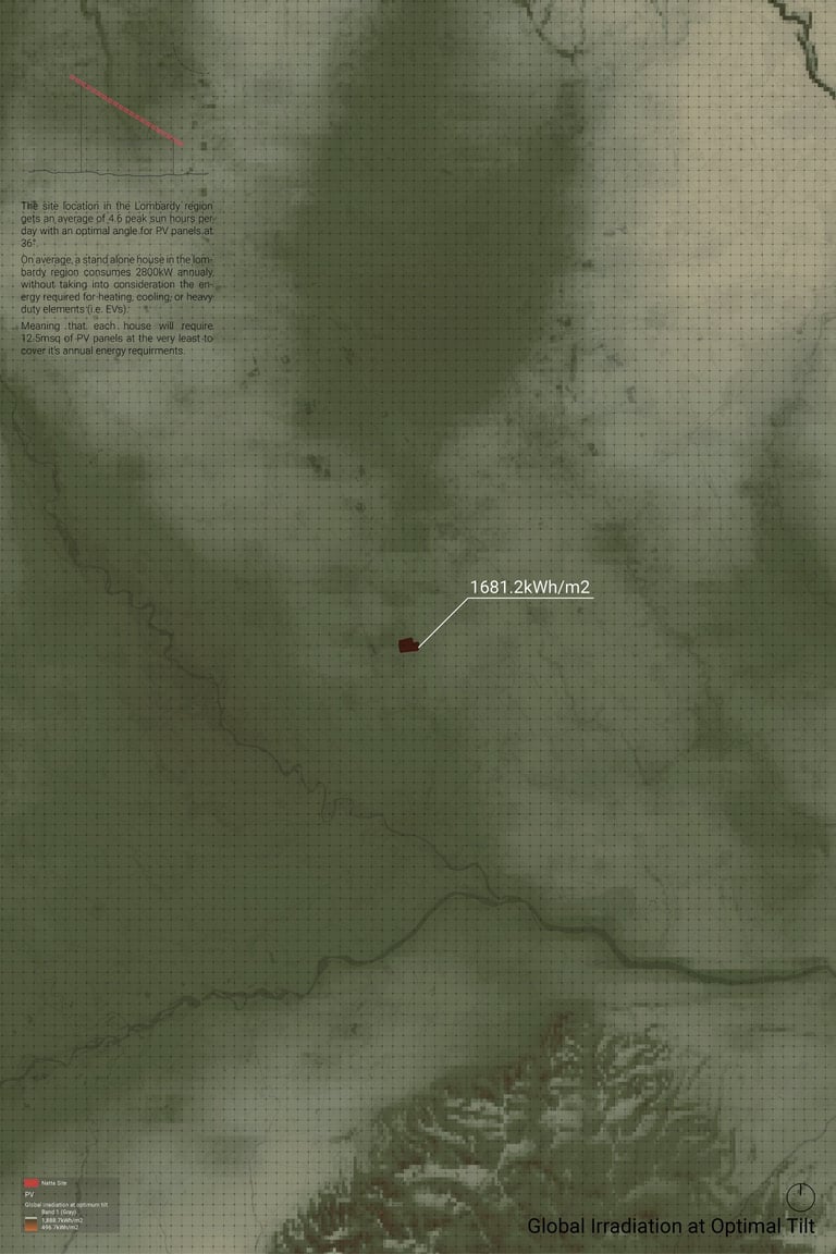 The site location in the Lombardy region gets an average of 4.6 peak sun hours per day with an optimal angle for PV panels at 36°. On average, a stand alone house in the Lombardy region consumes 2800kW annually without taking into consideration the energy required for heating, cooling, or heavy duty elements (i.e. EVs). Meaning that each house will require 12.5msq of PV panels at the very least to cover it’s annual energy requirements.
