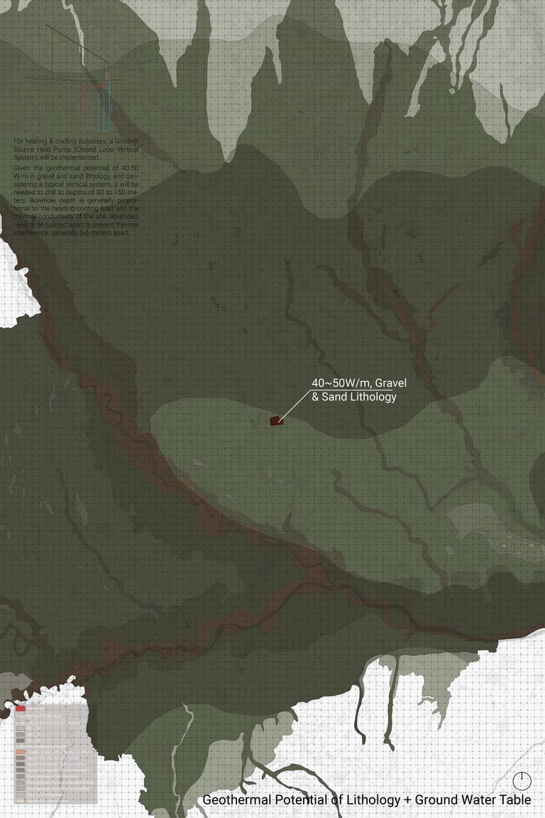 For heating & cooling purposes, a Ground-Source Heat Pump (Closed Loop Vertical System) will be implemented. Given the geothermal potential of 40-50 W/m in gravel and sand lithology, and considering a typical vertical system, it will be needed to drill to depths of 80 to 150 meters. Borehole depth is generally proportional to the heating/cooling load and the thermal conductivity of the soil. Boreholes need to be spaced apart to prevent thermal interference, generally 5-6 meters apart.