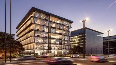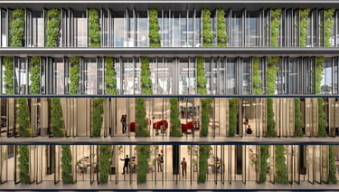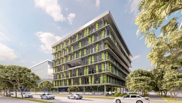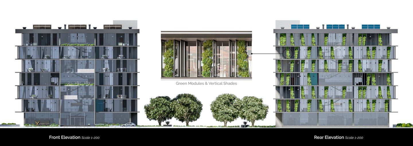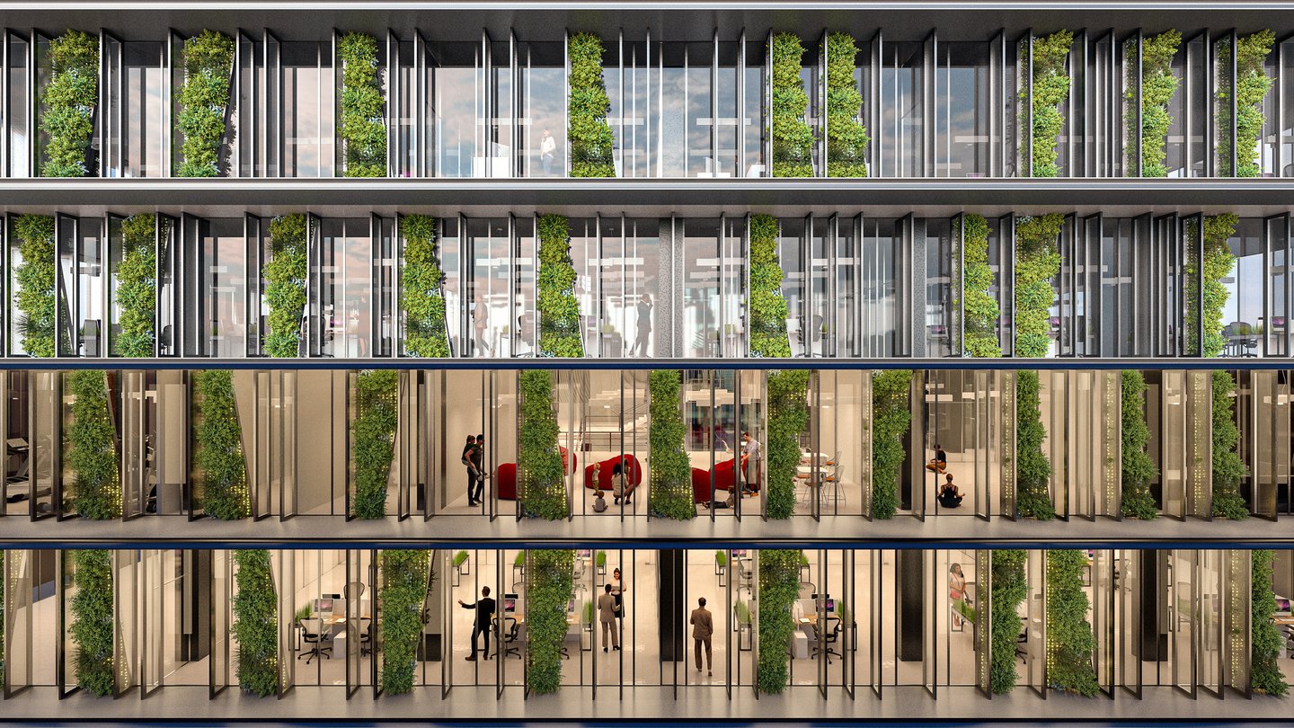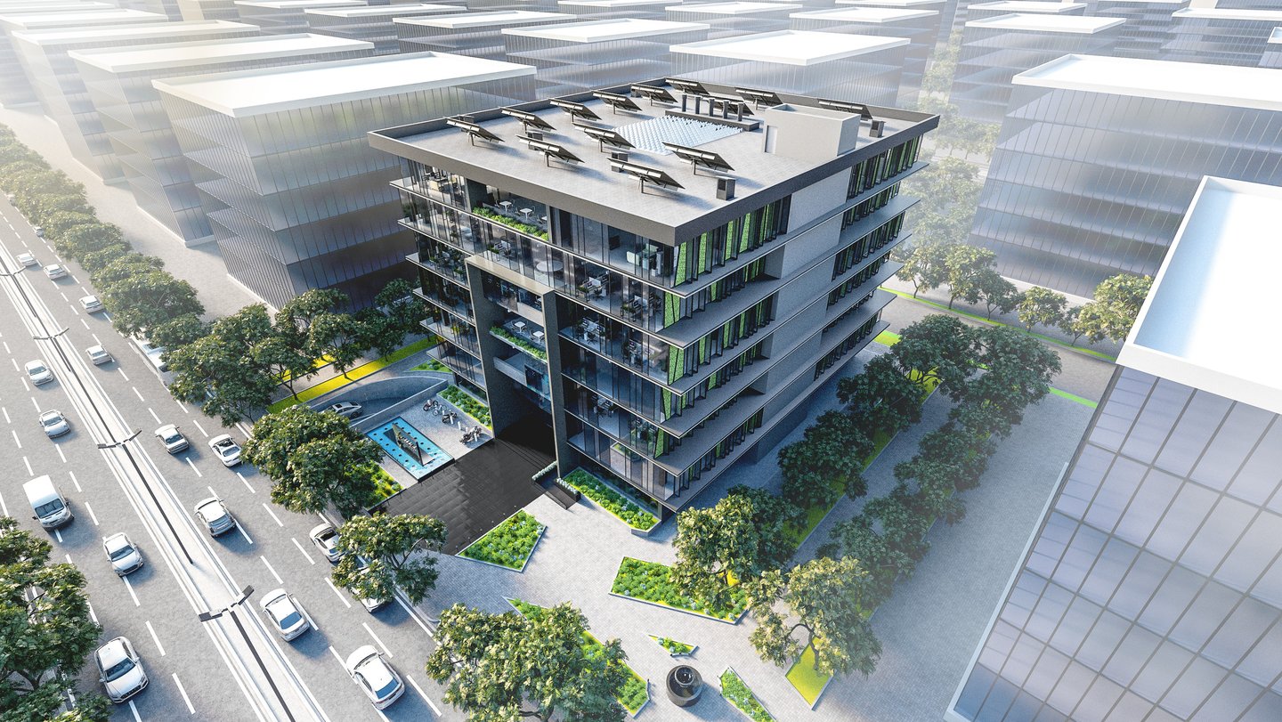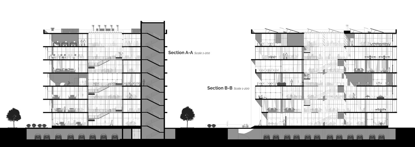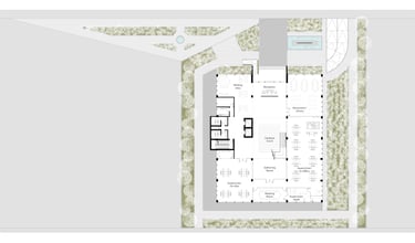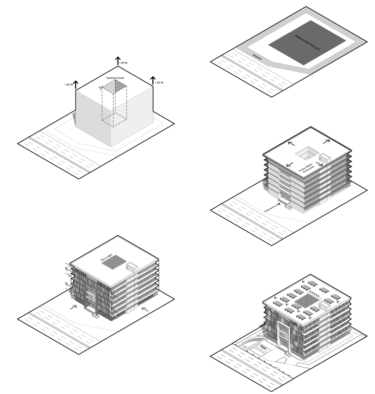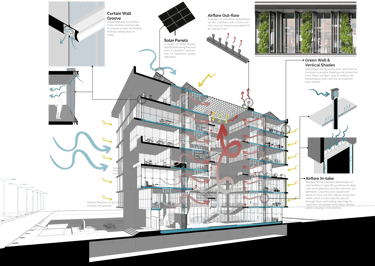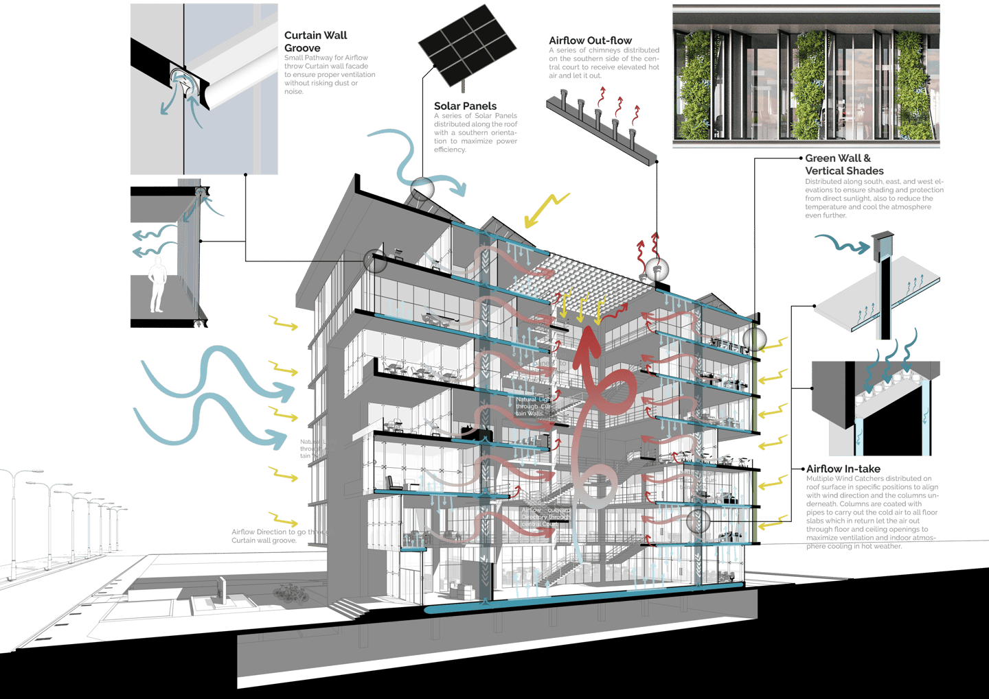The entire design revolves around sustainability, both for the building and for the people using it. For the building, my goal was to achieve a zero—or ideally negative—carbon footprint. All the facades are covered with green walls and vertical shades, except for the northern one, and the modules are arranged in a dynamic, non-uniform way. I made sure natural light penetrates the whole building through the central court and the surrounding curtain walls so energy consumption stays low. Solar panels are placed across the roof to generate power, and all windows are triple-glazed to provide proper thermal isolation. Ventilation is handled through several strategies: wind catchers, pipes embedded around columns and slabs, grooves in the curtain wall, and a suction system that channels air through the central court.