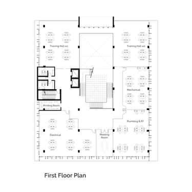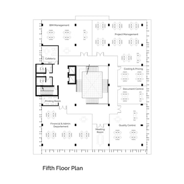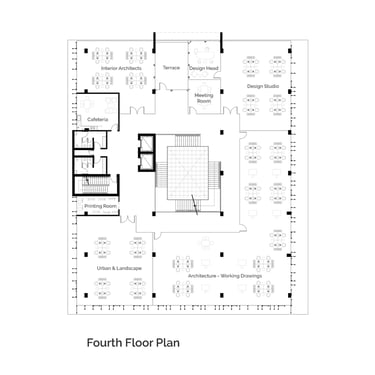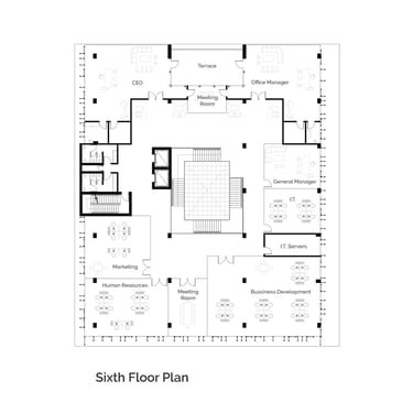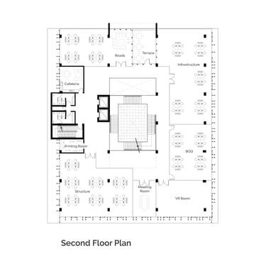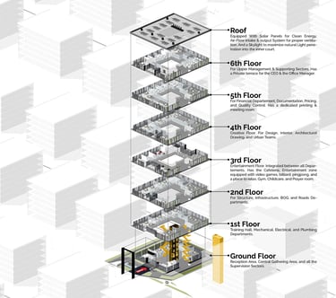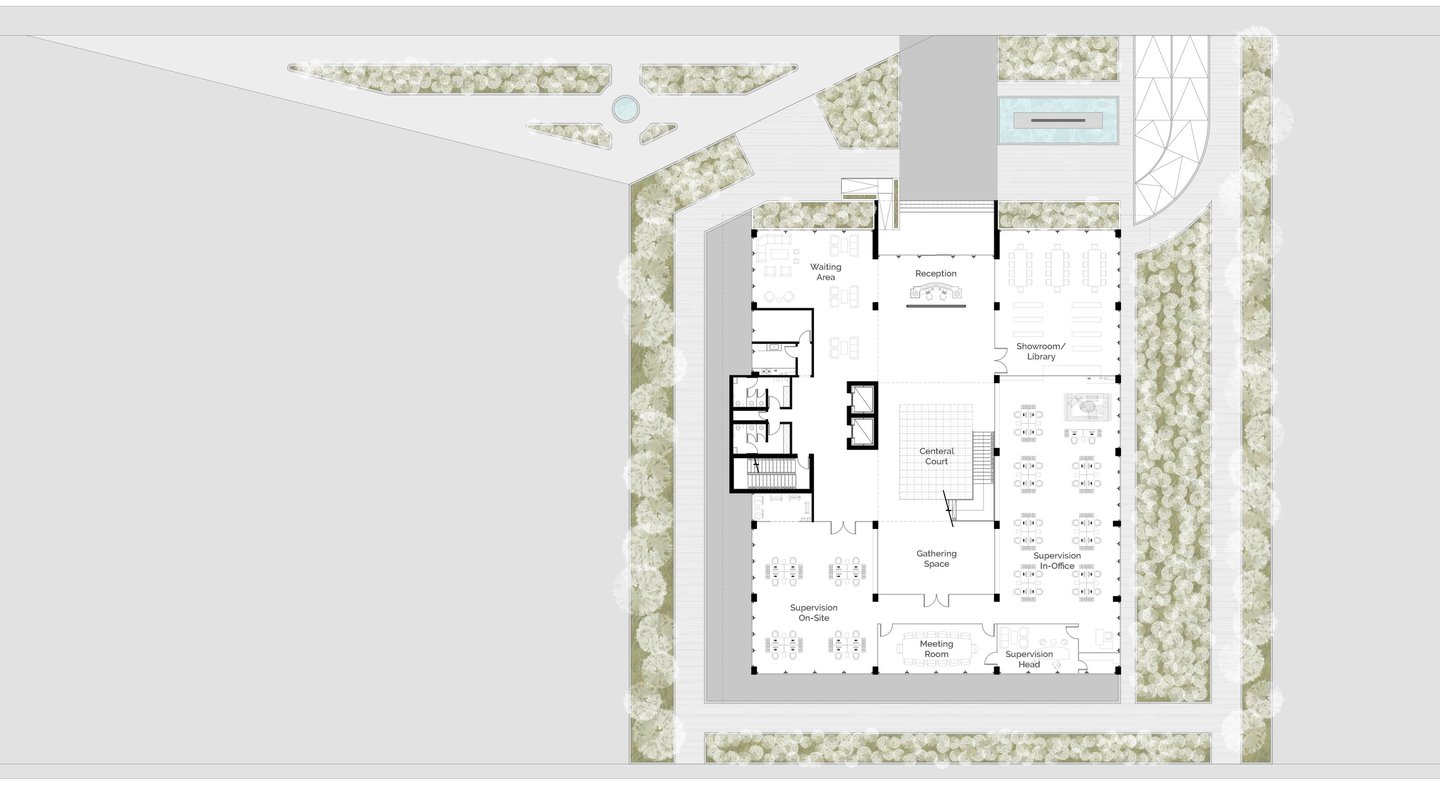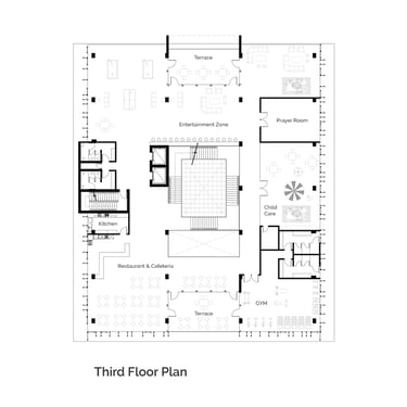 But sustainability here isn’t only about the building—it’s also about the employees. To support their well-being, I dedicated an entire floor to recreation and comfort. It includes entertainment areas, video games, a gym, a cafeteria, and a prayer room, all located on the third floor so every department can access them easily. I used a free-plan layout to allow full customization depending on employees’ needs, and I positioned all spaces around the central courtyard and exterior glazing so everyone has wide, open views. I also added terraces for fresh air, including designated areas for smokers. To keep everything connected, program elements are arranged by functional relationships on each floor, but all departments link back to the central court and its spiral staircase.