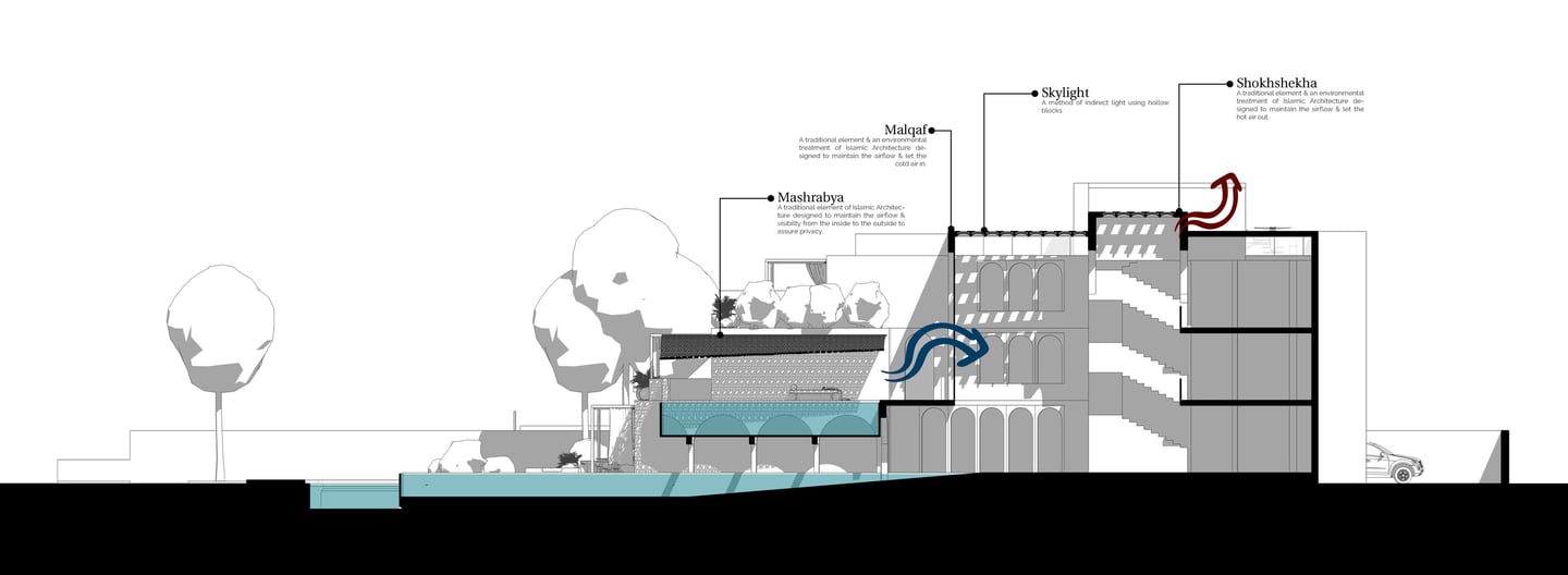 The house is designed mainly on principles of Islamic Architecture. Despite being so rich in its details the house has a minimal design, yet the core principles were applied. The inner court (creates a micro climate), Mashrabya, Malqaf (Lets in cold air), Arches, and the Shokhshekha (releases hot air), all are applied to increase sustainability, create a micro-climate and utilize forgotten yet so powerful treatments.