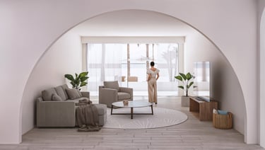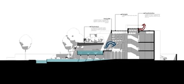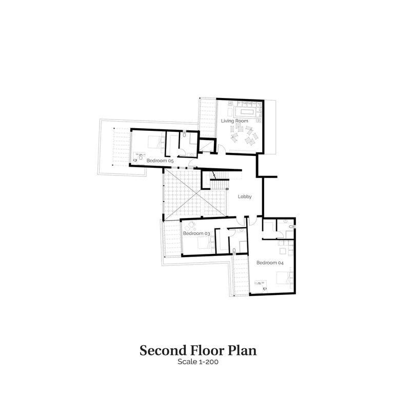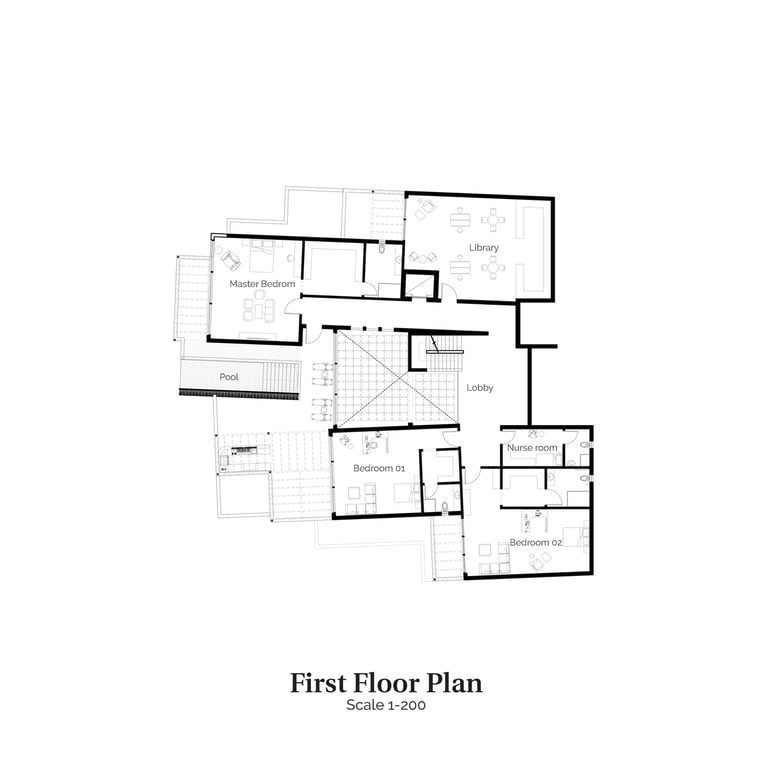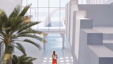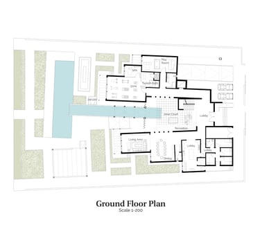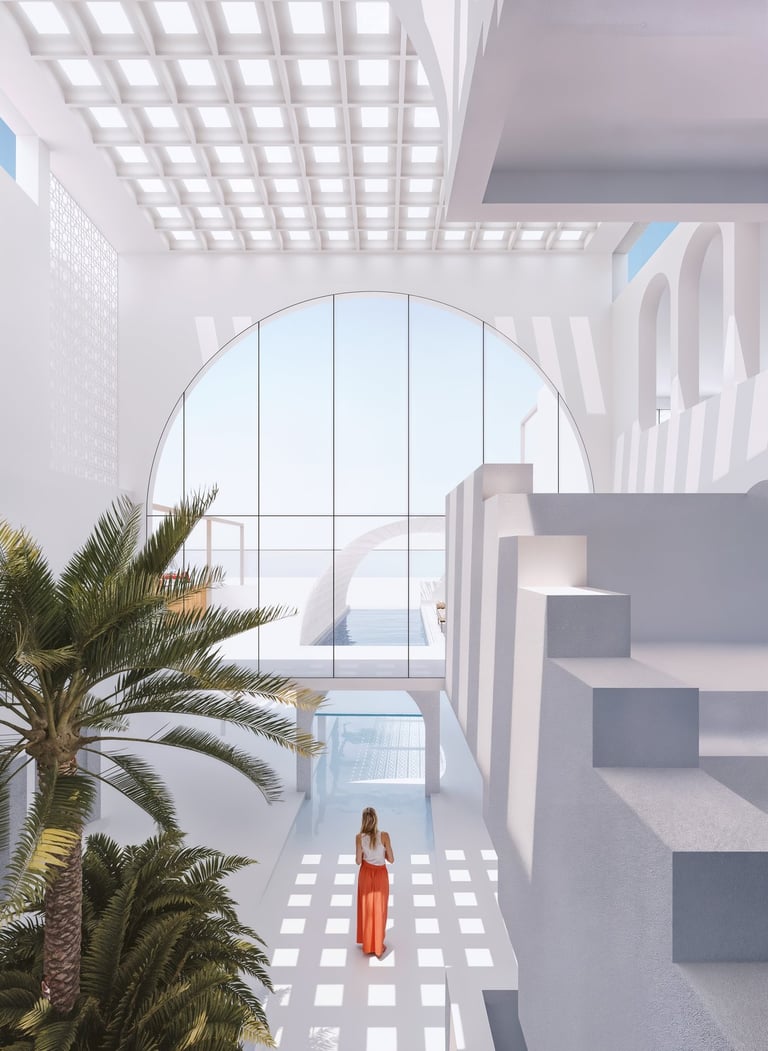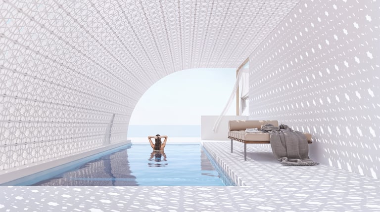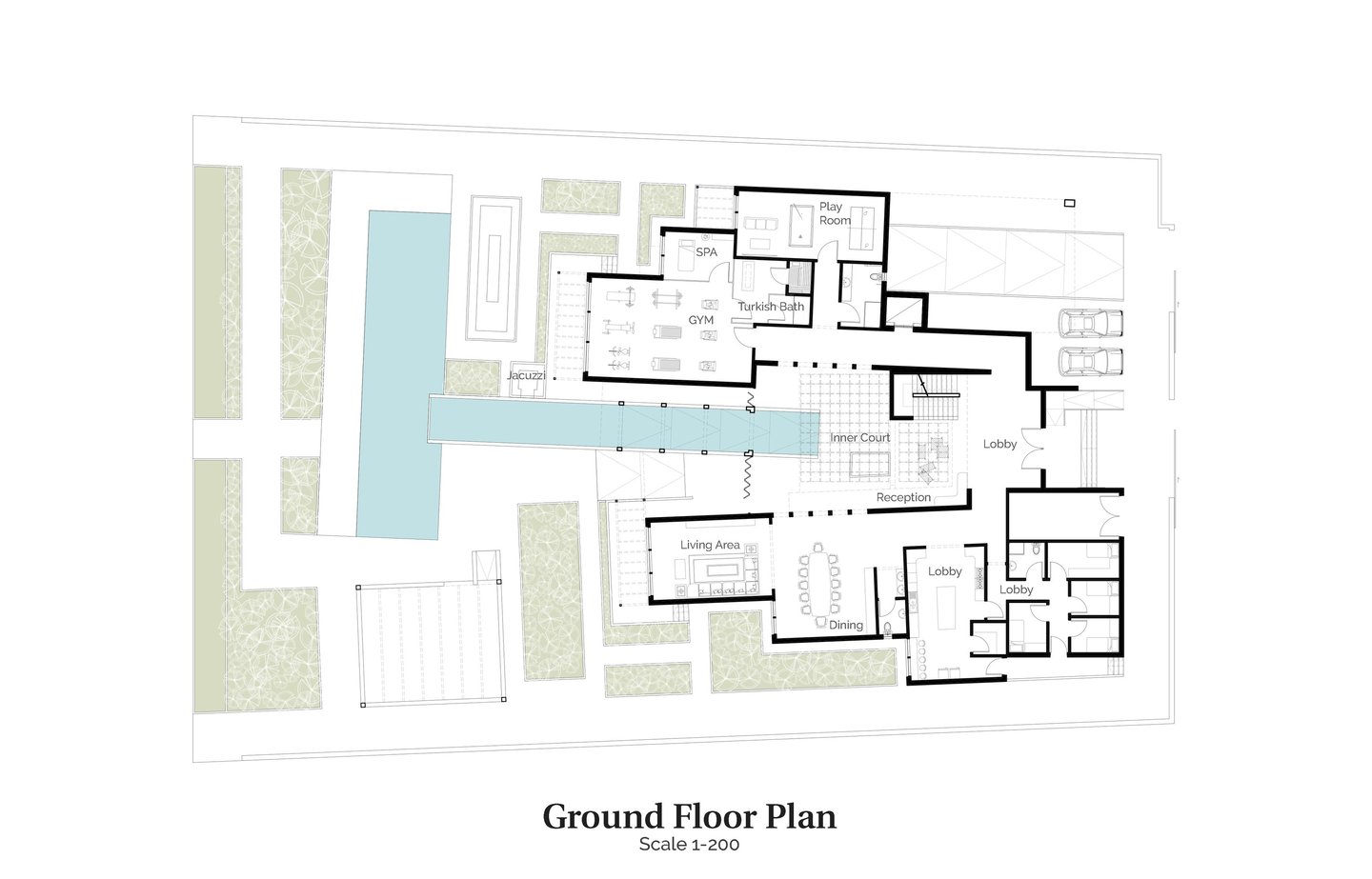 The house is designed specifically not to disrupt this harmony, but to complete it. Be that as it may, it is affected by all elements. The more the masses elevate, the more they are pushed in, simulating erosion by the continuous waves. All permeable spaces orientation is designed to maintain airflow and make it continue throughout the house seamlessly. Visual connectivity to both sea and sky from entry & all spaces mimicking the clear water of the gulf.