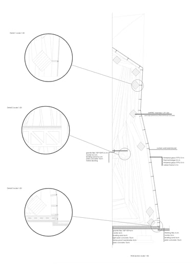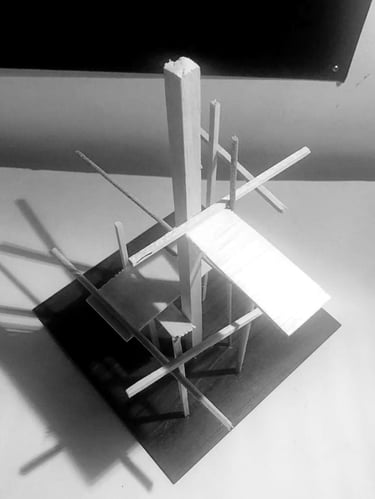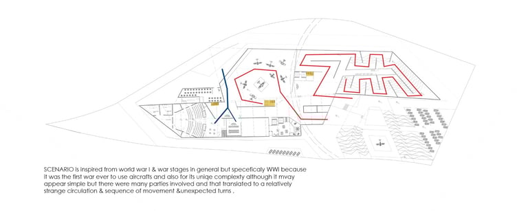 The architectural concept for this WWII-era aviation museum is driven by the dynamic interplay of three core tenets: Oscillation, Abstraction, and Penetration. The design embodies Oscillation—reflecting the intense experiential dichotomy between the stillness of preparation and the velocity of flight—by articulating the museum as two joined, linear, yet completely asymmetrical masses, each emphasizing a distinct state of being. The theme of Abstraction pays homage to the history of aviation engineering, tracing the evolution from organic bird forms to mechanical aircraft; this is realized through extensive curtain walls that expose the building's structural skeleton, arranged on a grid derived from Leonardo da Vinci’s foundational flying machine studies. Finally, the action of flight is captured through Penetration, symbolizing aircraft breaking physical limits; this is forcefully translated into a pedestrian bridge that pierces the architectural volume, carving a depression on one facade and forcing an extrusion on the other, thereby shaping the building through the dynamic vector of the adjacent infrastructure.