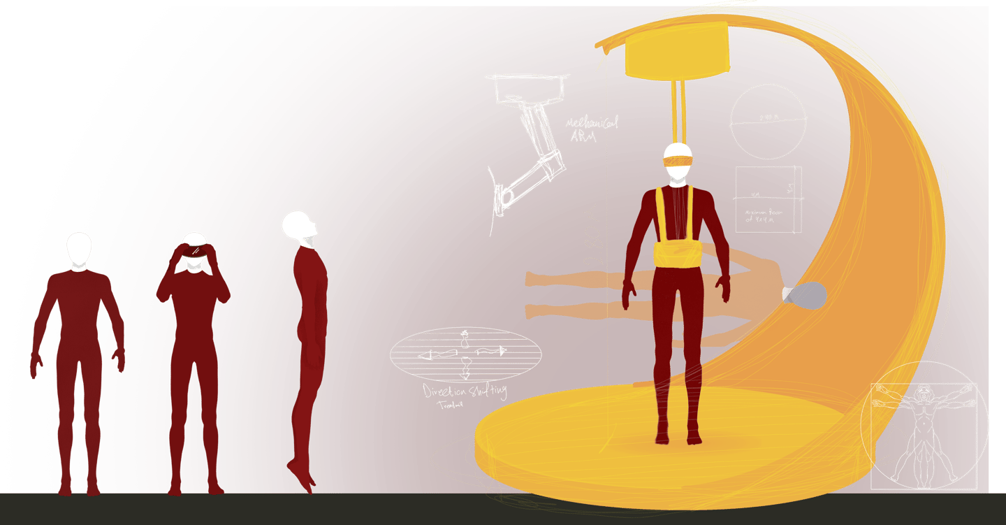 In the “Real World” the site can be anywhere one can setup a portal to the Virtual World, “Shuttle”, designed to carry a fully grown human in every condition possible to simulate whatever one might want, equipped with a mechanical arm to carry the user, haptic suit to feel every hit, texture or temperature, multi directional treadmill and finally the goggles to see through.
