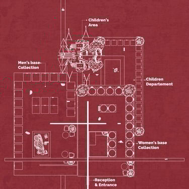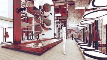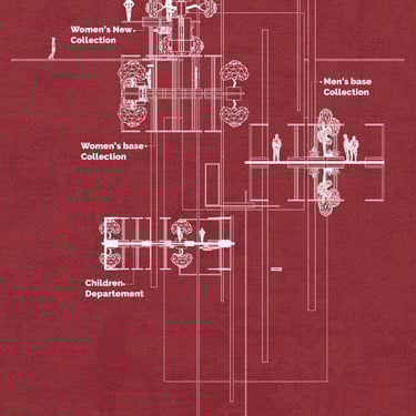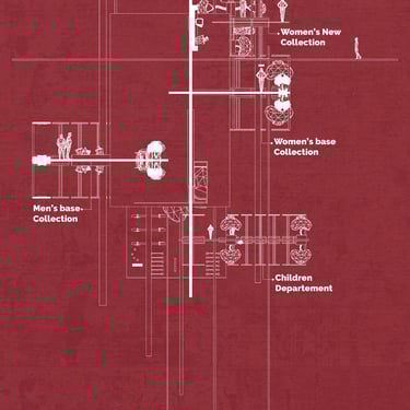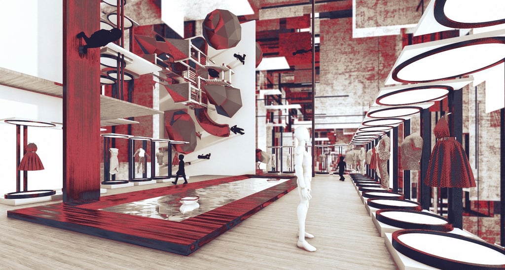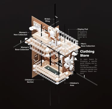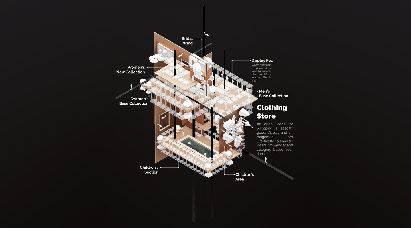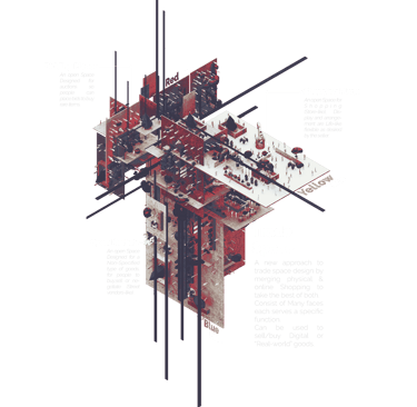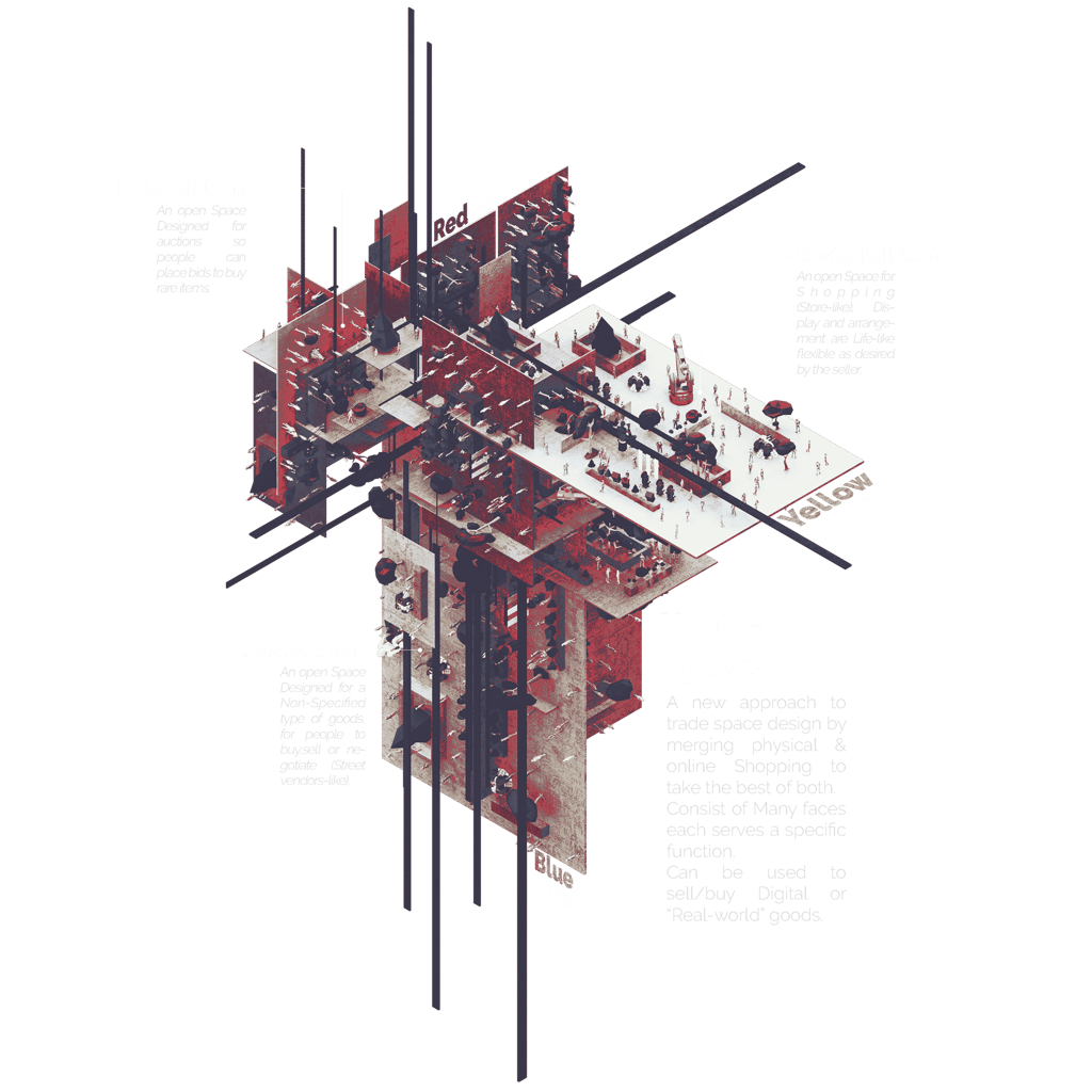 It is presented in an uneven grid of intersecting planes manner forming an infinite net of spaces within, consisting of a variety of spaces that are traditionally found in “Real-World” Trade-Spaces, but with a small tweak of mixing the online and the physical shopping experience to simulate the best possible experience in an infinite world of non-sponsored commodities.