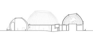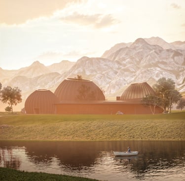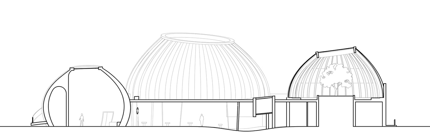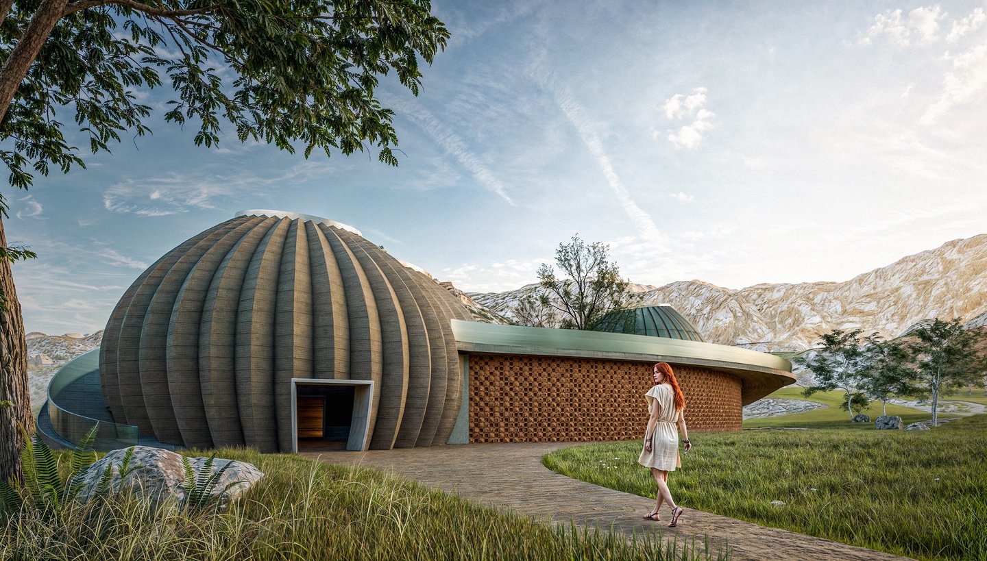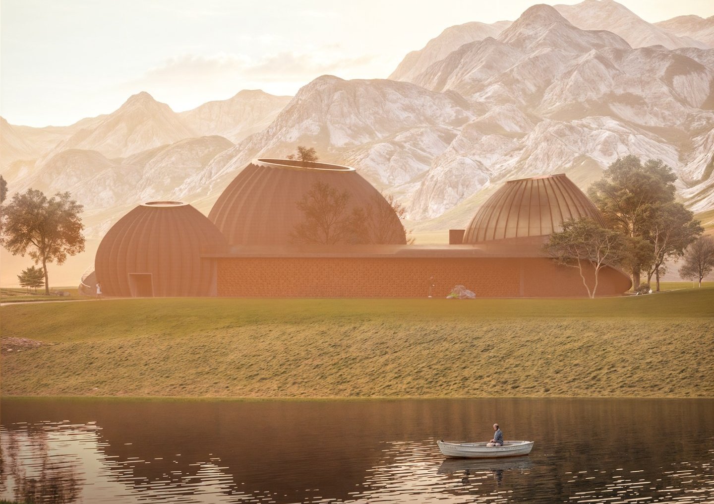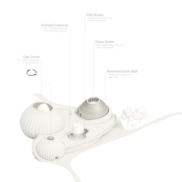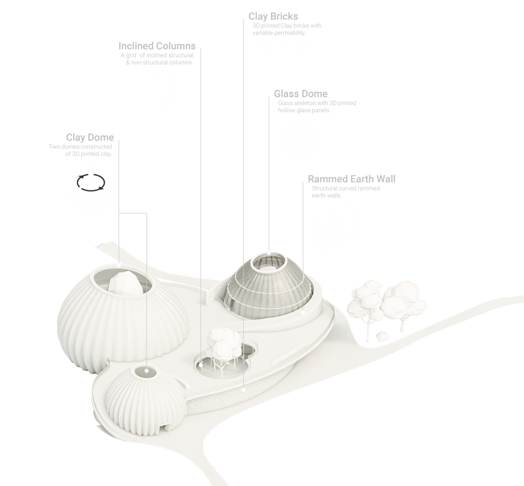 The project is defined by three domes and the space in between. Two are created using clay 3D printing technology, while the third is made from 3D-printed hollow glass panels supported by a glass-beam skeleton. These domes are connected through a concrete platform, curved at its ends to form ramps. This platform rests on rammed-earth walls and a grid of inclined metal columns, varying in thickness, orientation, and density.
