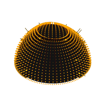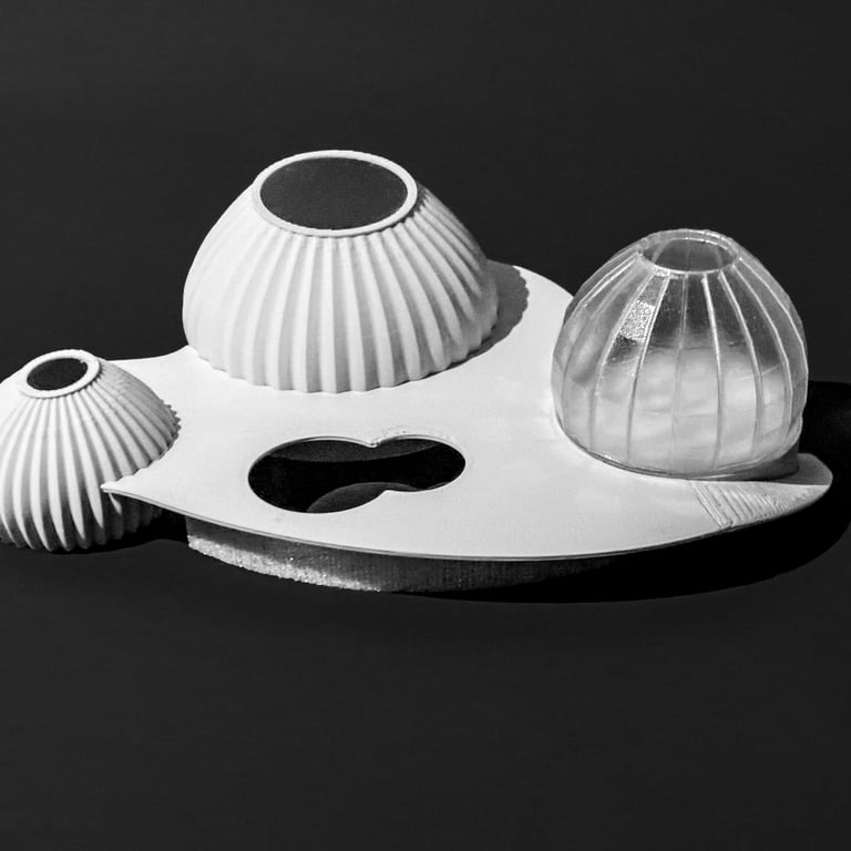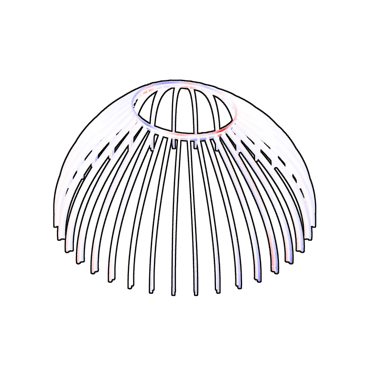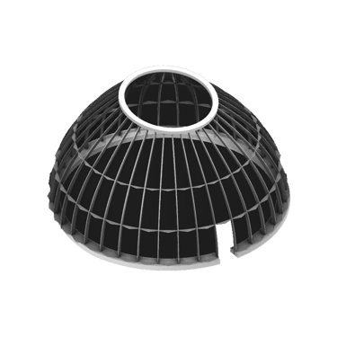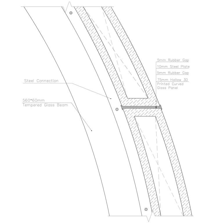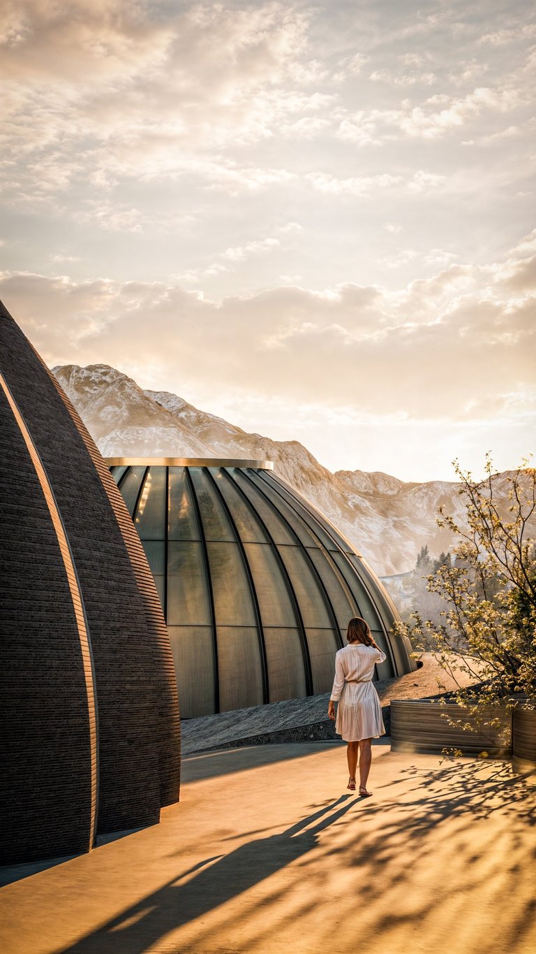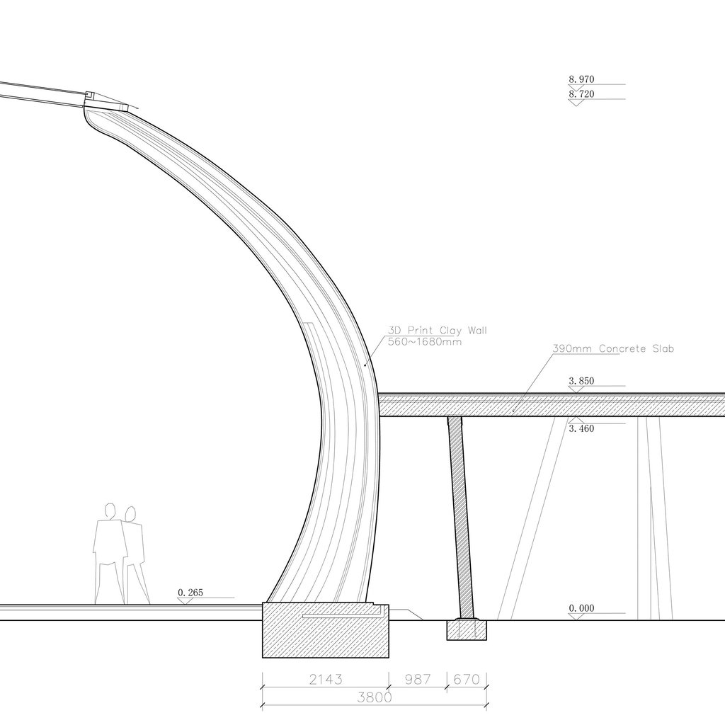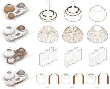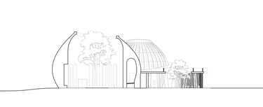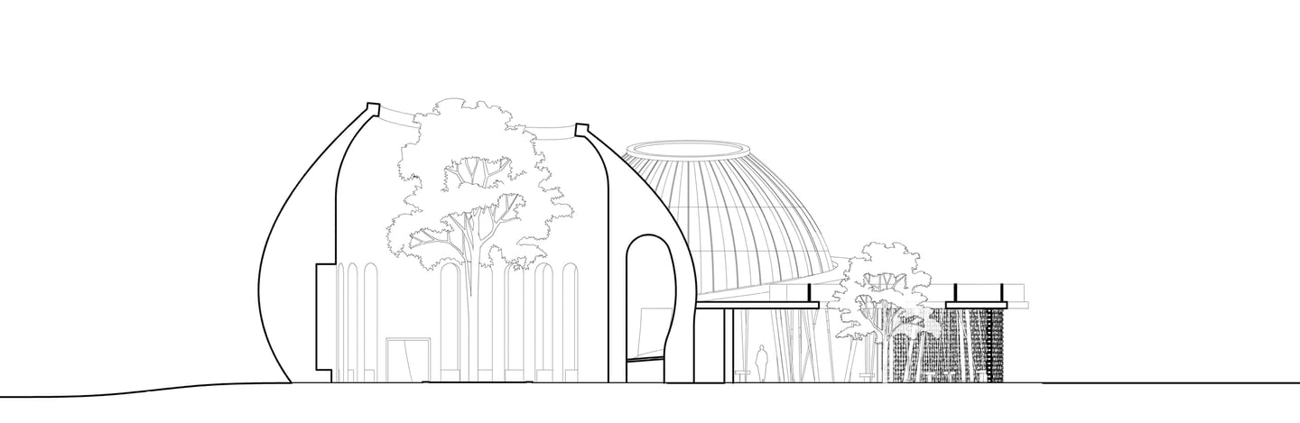 The project is defined by three domes and the space in between. Two are created using clay 3D printing technology, while the third is made from 3D-printed hollow glass panels supported by a glass-beam skeleton. These domes are connected through a concrete platform, curved at its ends to form ramps. This platform rests on rammed-earth walls and a grid of inclined metal columns, varying in thickness, orientation, and density.