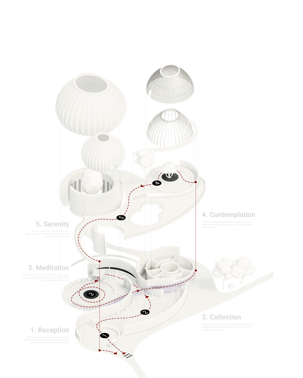 “We come from Earth, we return to Earth.” A timeless phrase whispers through the ages, calling us back to nature’s embrace. In our pursuit of the stars, we often neglect the treasures beneath our feet. What if ancient wisdom melded with modern innovation? PATH TO SERENITY is a journey, a sanctuary for the stressed, a haven for contemplation and meditation, a pilgrimage towards inner peace. This architectural odyssey unfolds through five distinct spaces, each designed for a unique purpose.