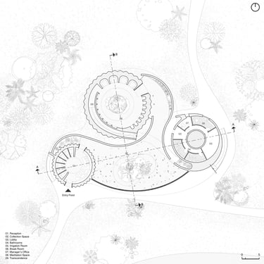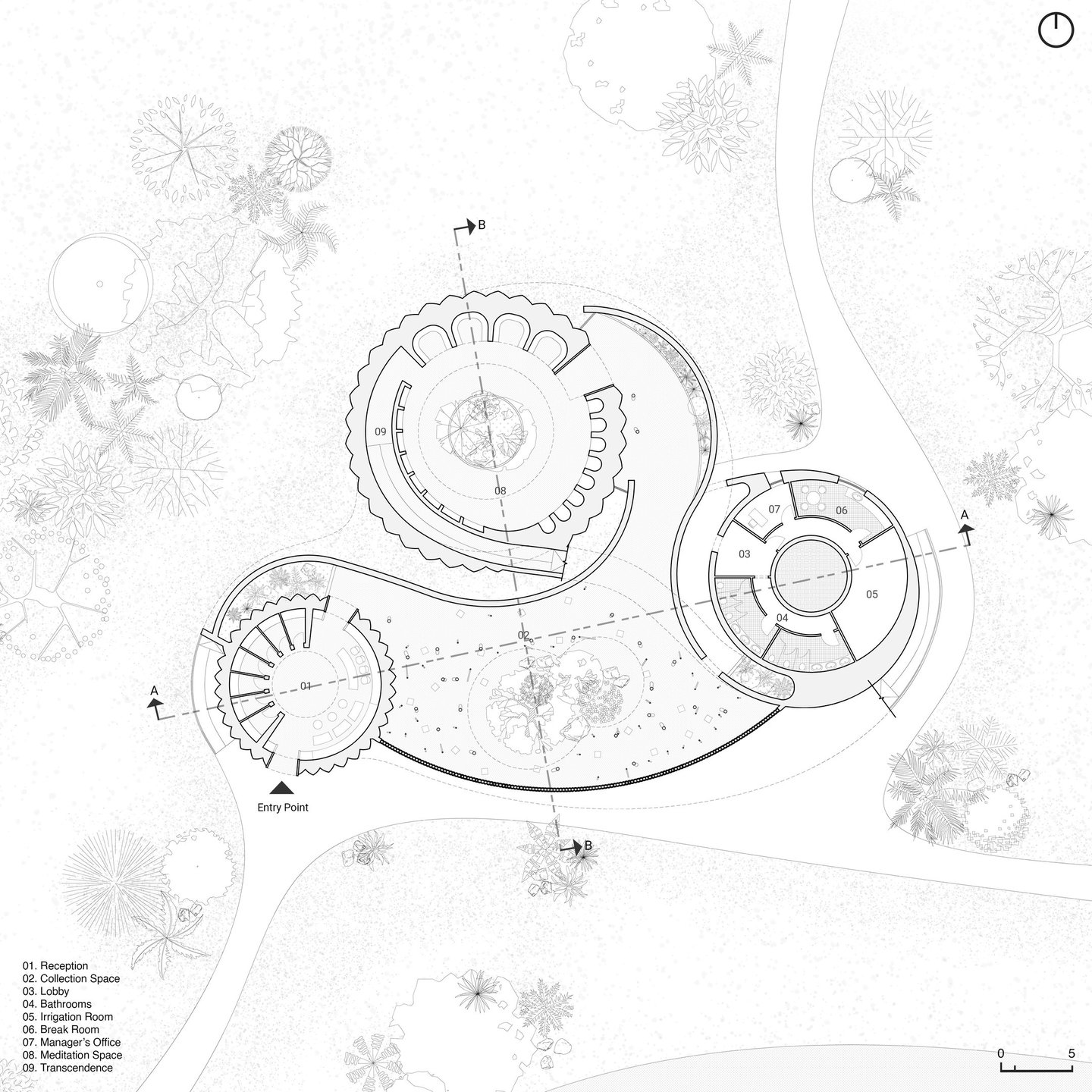 The Collection Space follows, an open area where light filters through inclined, slender columns, mimicking a serene forest. Here, a central boulder under a skylight offers seeds nestled in its crevices, inviting pilgrims to gather and reflect.