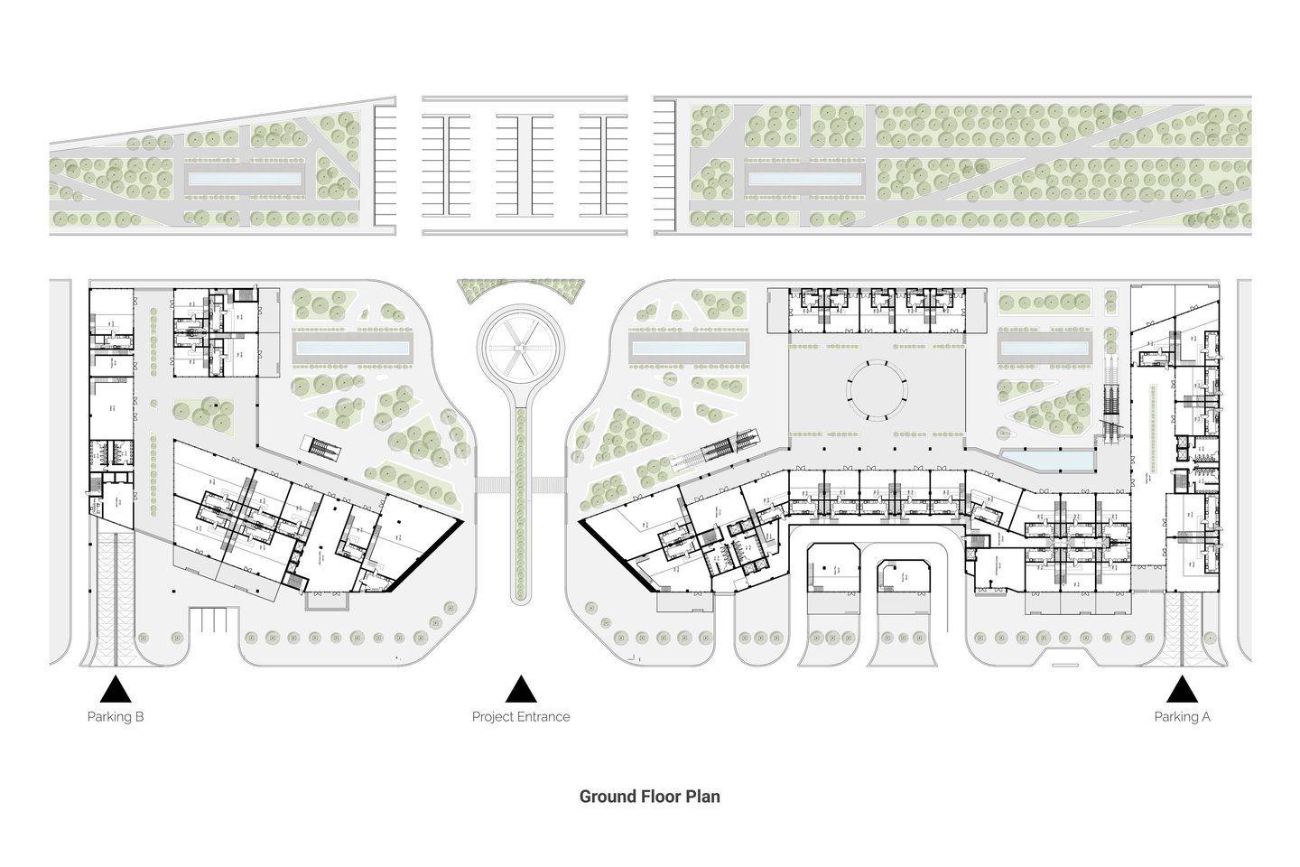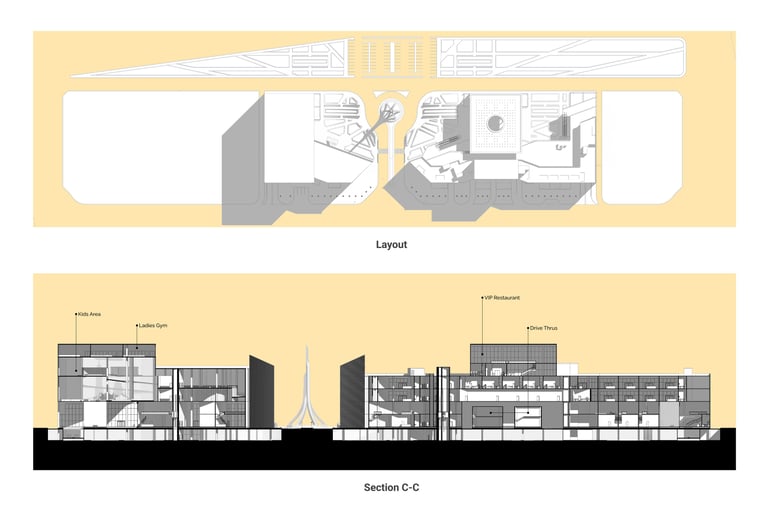 An iconic Landmark rose in the centerline of symmetry between the two side of the project to define it and give it meaning. Engraved with Squares logo in a subtle way to create a sense of belonging and identity.